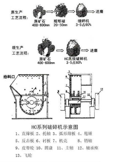 產品概述: HC高效節能破碎機是我公司工程技術人員經過反復實踐與探索研制出的 種新型產品,它廣泛適用于石料廠。人工砂和水泥生料原料破碎,尤其適宜對石灰石、白云石、頁巖、石膏礦、熒石、煤矸石等中硬脆性物料,進料粒度大、出料粒度小且均勻、并且可根據不同需要選擇和預定篩板,是礦山、水泥、建材企業比較理想的一級破碎設備。改寫了水泥生料設備工藝并減少1/3的設備投資和節省1/2的電耗,省去了大量的維修費用。